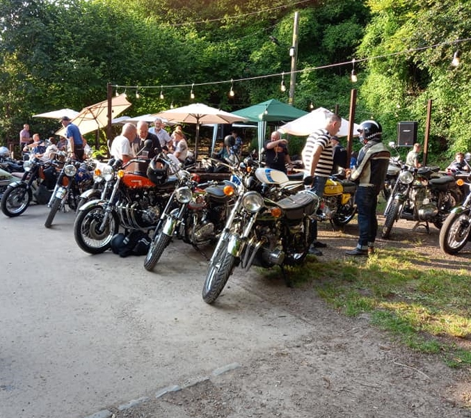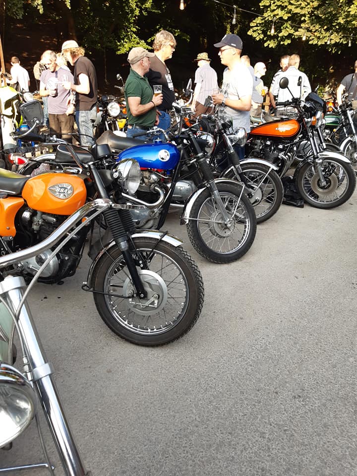 | We had great weather yet again & I think we had one of the best nights we've had. There were more classic bikes than ever filling all the available spaces outside the pub. Thanks to Mandy & Laurence for the music/PA & some of the photos. Laurence also won the "...so then I laid it down" trophy for throwing someone elses BMW away while on holiday. Dermots competing event probably did us a favour & took a few modern bikes, otherwise we could easily been overcrowded. |